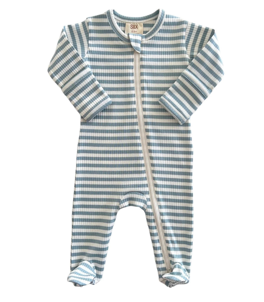 Ribbed Zip Footie Romper | Dusty Blue Stripes - PREORDER