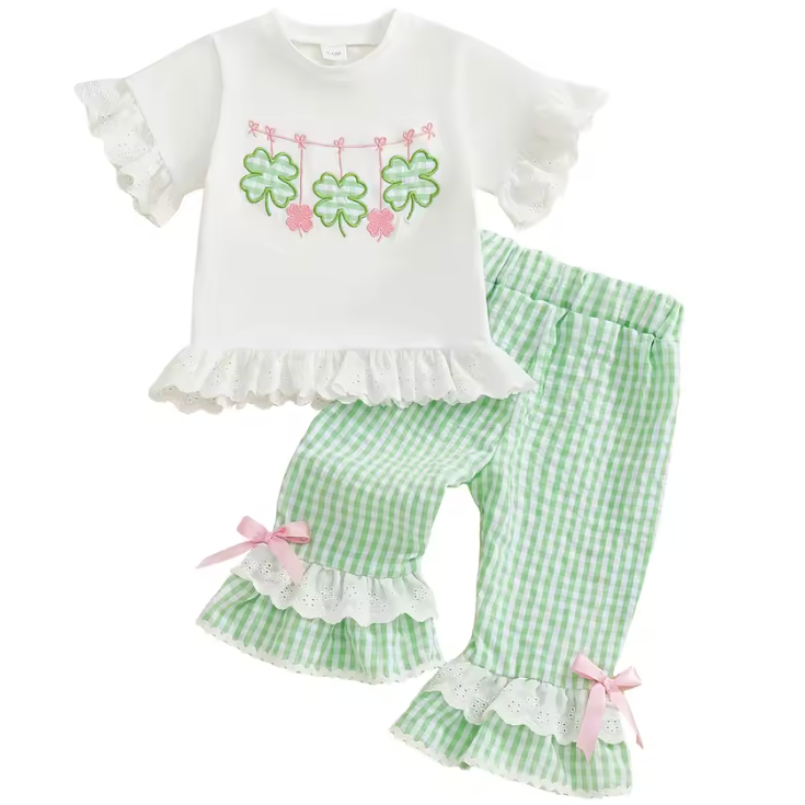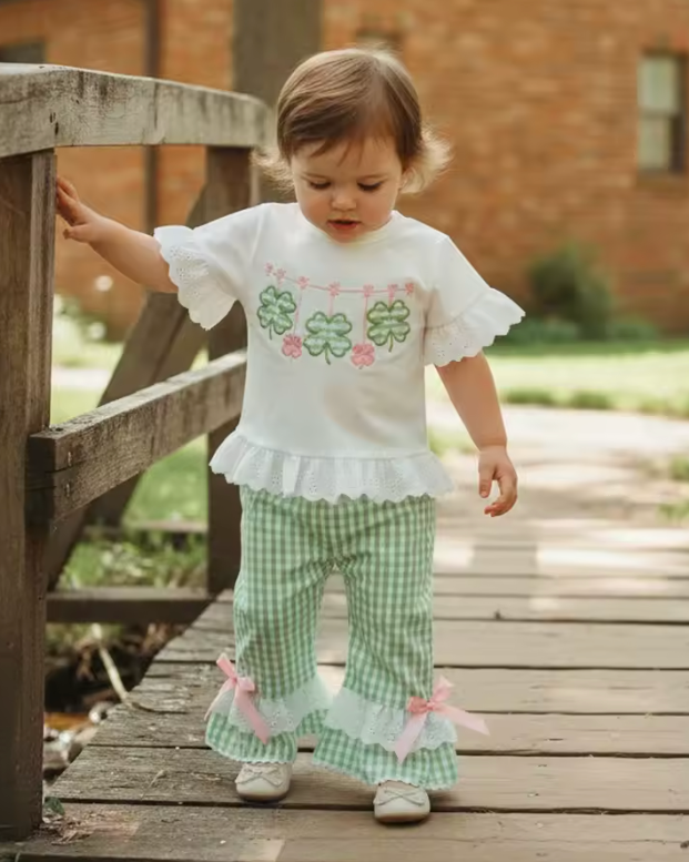Ruffle Top & Pants Set | Gingham Green Clovers - PREORDER