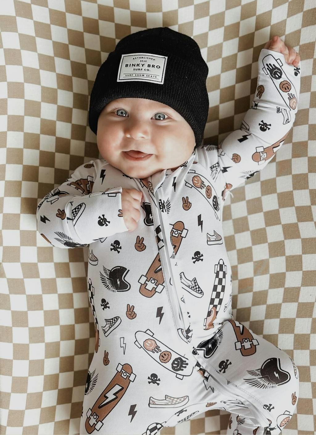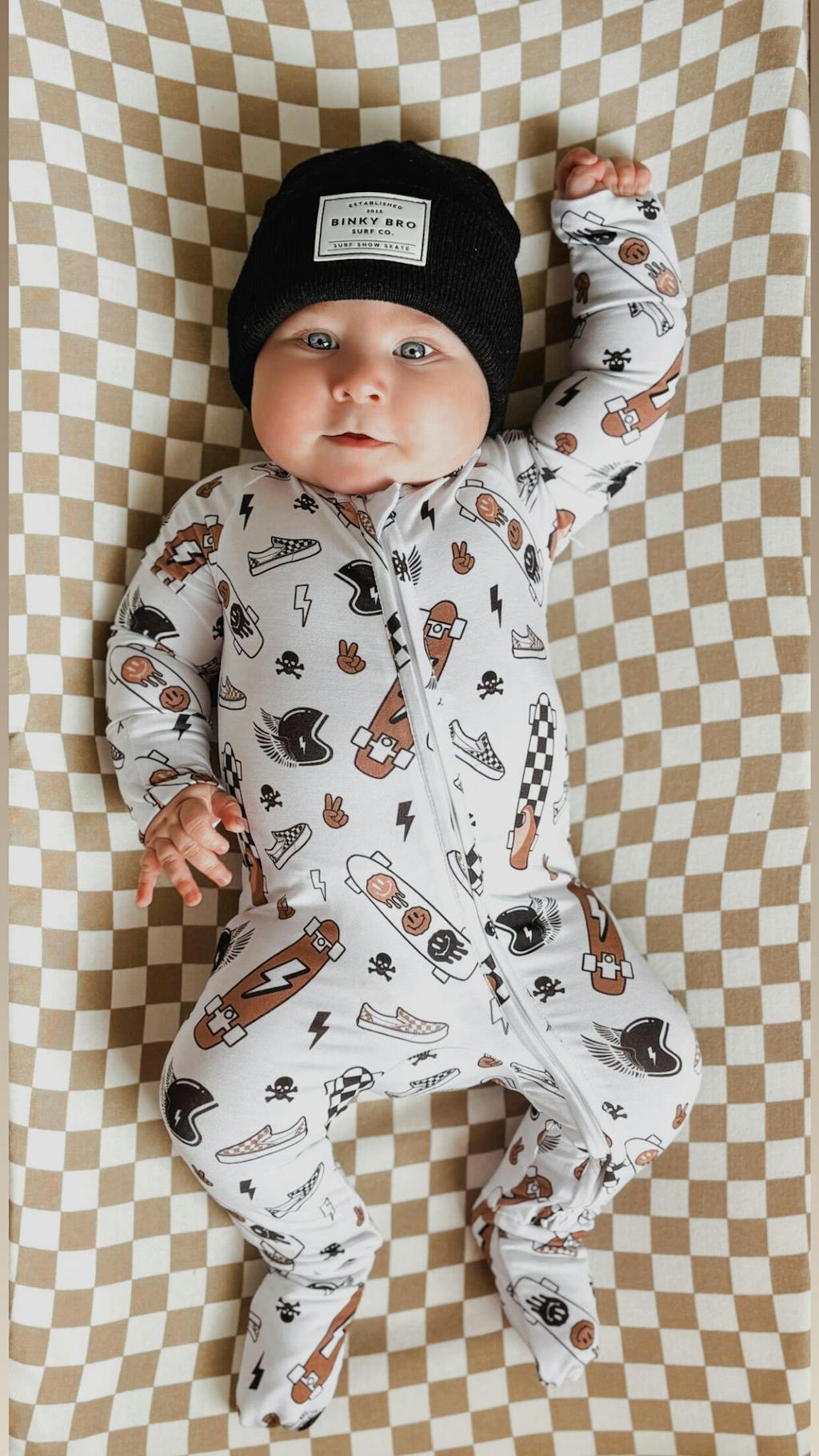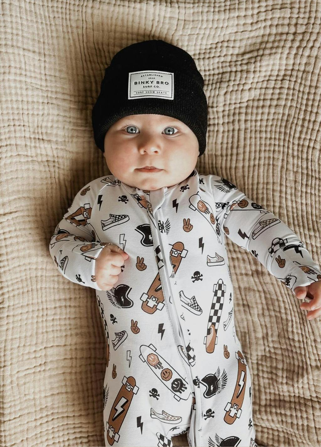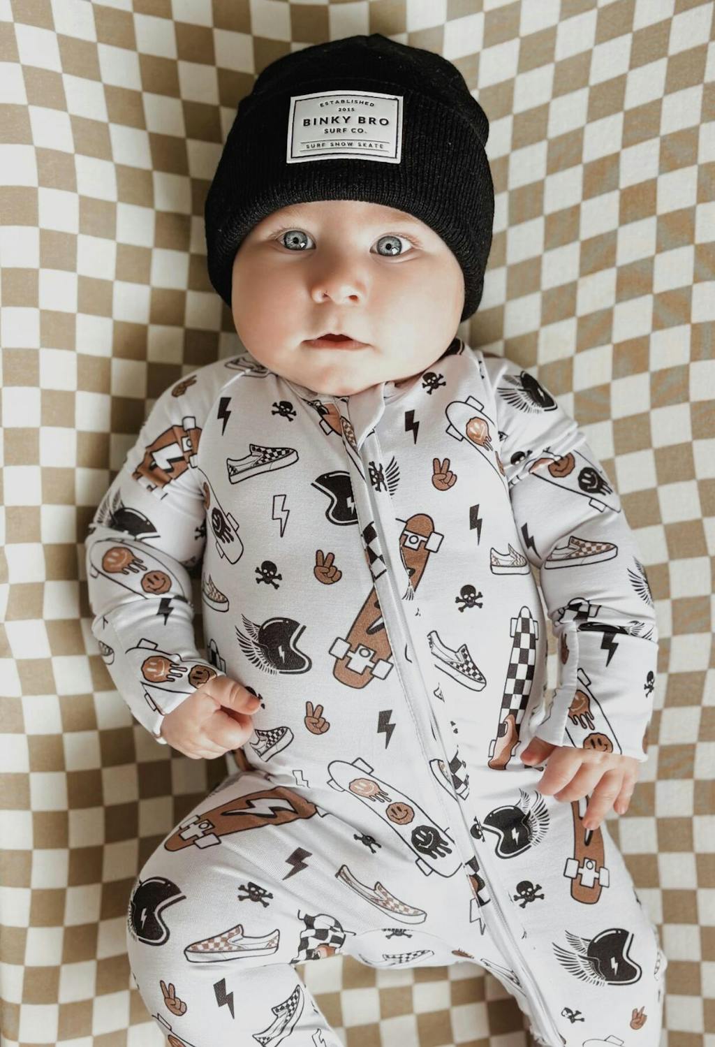 Bold boards, cool kicks, and cozy bamboo fabric—the Bamboo Zip Romper | Sk8er has it all.