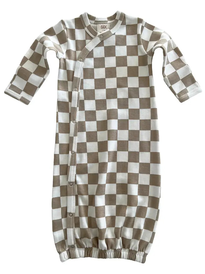 Checkerboard is bold and cheerful: perfect for your little one. On the Organic Gown, now you have ultimate convenience and comfort, too. Newborns can grow with this gown, and parents love how easy diaper changes are. Features side snaps and built-in mitten cuffs.