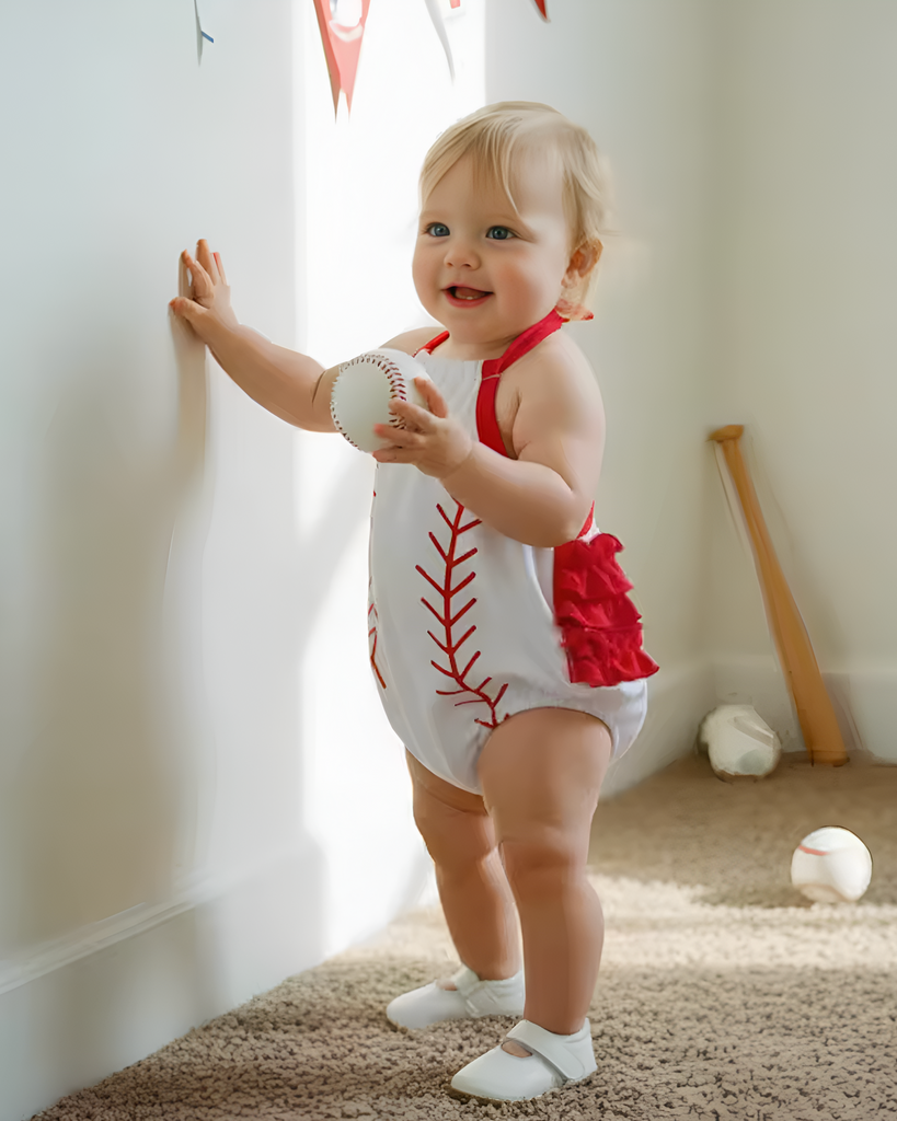 Baby Girls Baseball Themed Rompers Comfortable Sleeveless Halter Strap Ruffled Embroidered Jumpsuit Cute Newborn Outfit