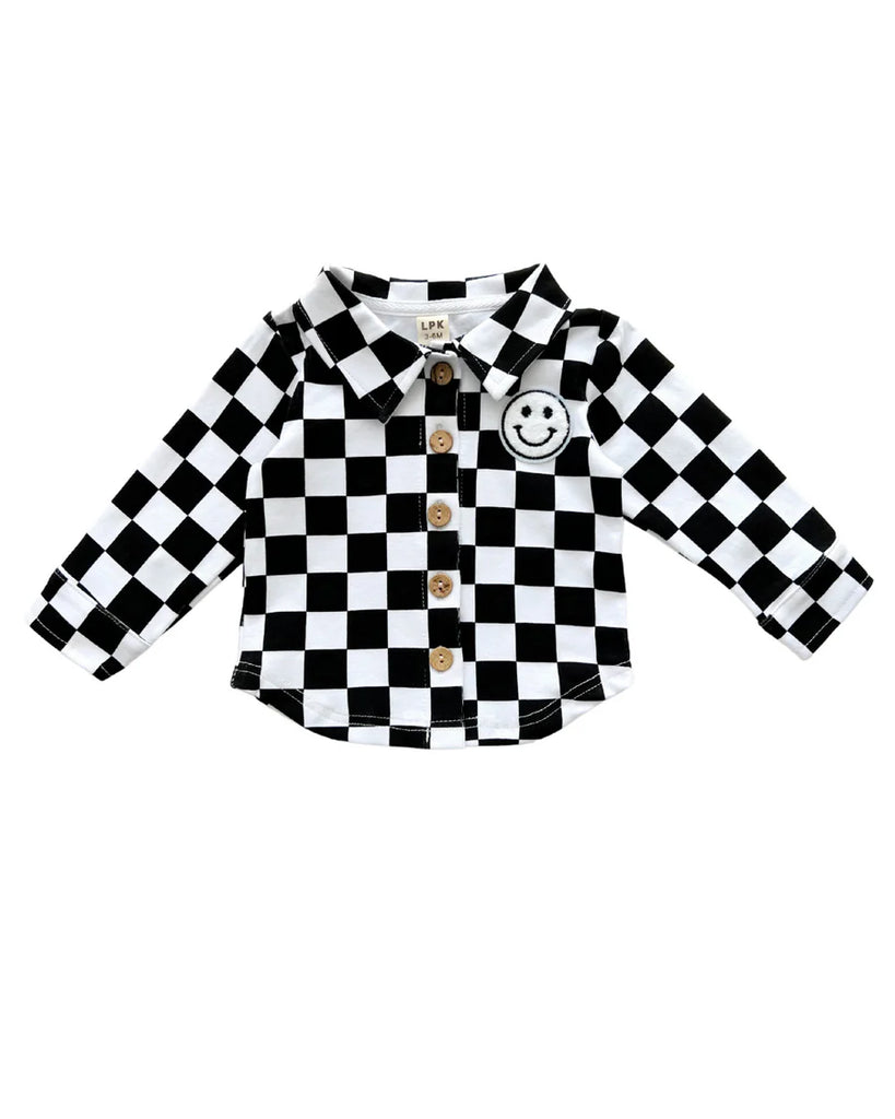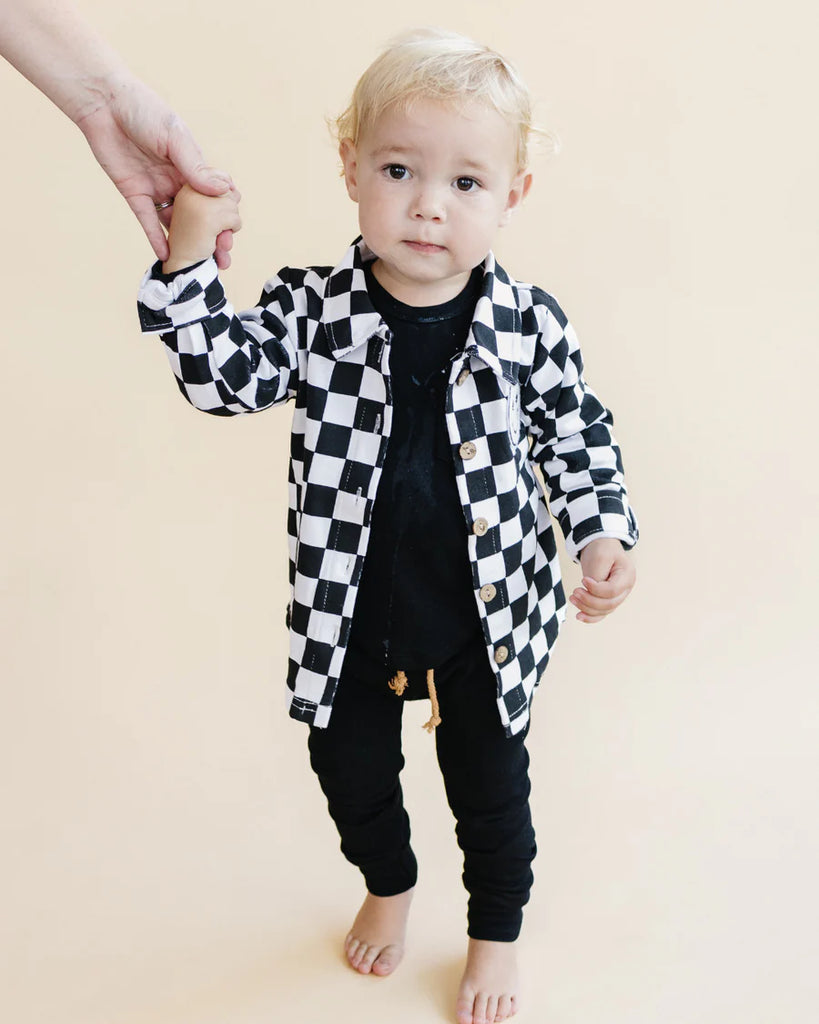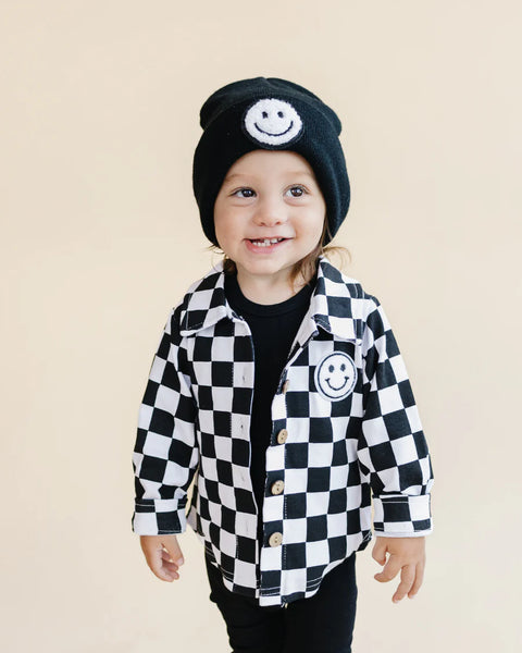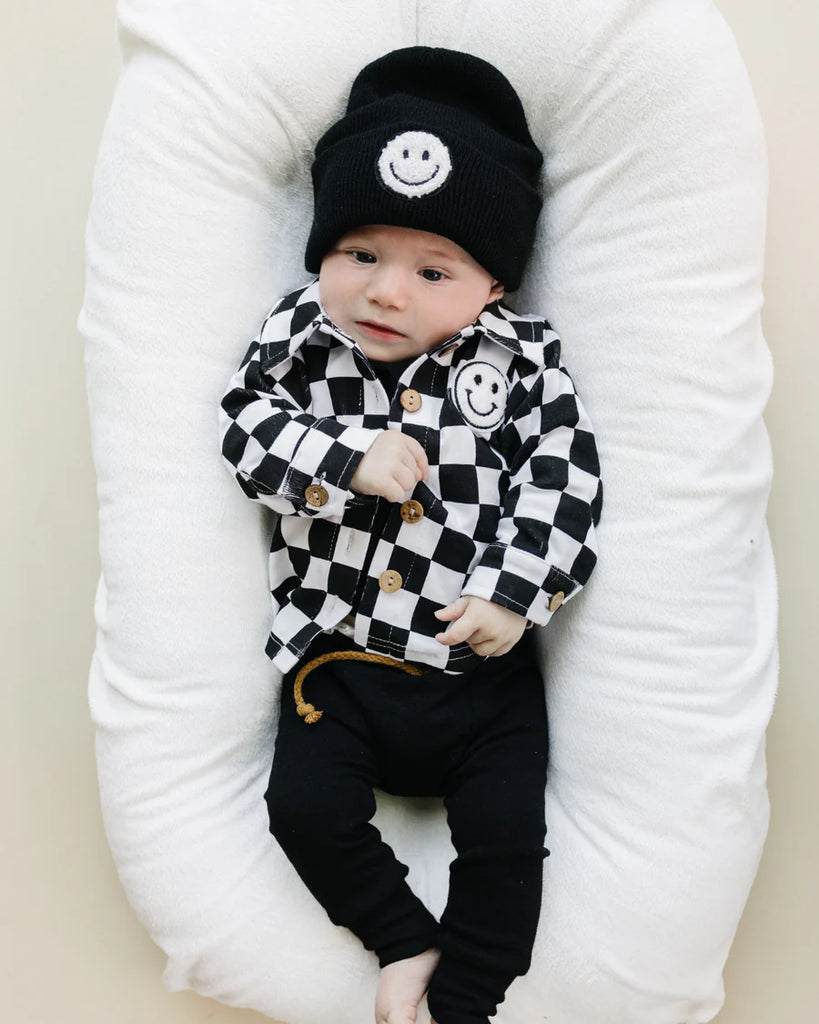 It’s shacket season! Made from soft cotton, this piece is perfect for layering or wearing on its own. With a functional button closure at the front, you can effortlessly transition from casual to dressy, making it a versatile addition to your wardrobe. Pair it with one of our cotton lounge sets and a smiley beanie to complete the look! Available in sizes from newborn to 9Y.