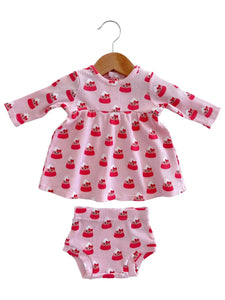 Designed to fit perfectly without the need to size up, this cozy dress features a convenient bloomer for easy diaper changes and adorable ruffle details for added charm. Made from 100% organic cotton, this outfit is as soft as it is adorable, providing a gentle, breathable layer for your baby’s delicate skin. The subtle waffle texture offers both warmth and stretch, while the sweet ruffle detailing adds a charming touch to this already-perfect outfit.