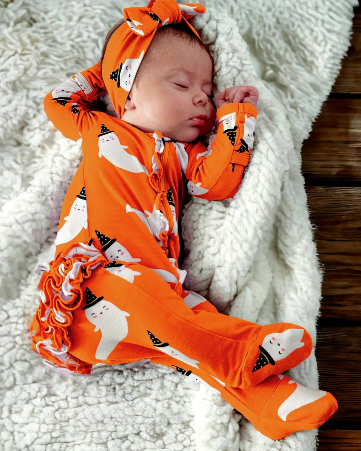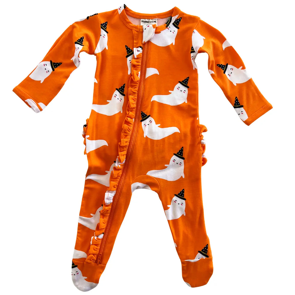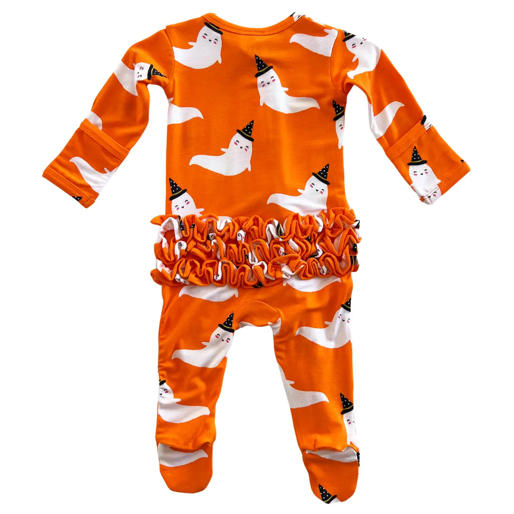 Zip Ruffle Footie Romper | Orange Ghost - PREORDER